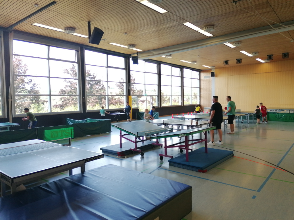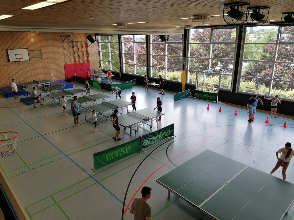 Die Saison neigt sich dem Ende entgegen und endet mit einigen Highlights. Am 23. Juli stand mit einem Eltern-Kind-Training etwas besonderes an. 15 Kinder aus dem Einsteiger-Training trainierten, aufgeteilt in 2 Gruppen, gemeinsam mit ihren Eltern. An 10 abwechslungsreichen Stationen durften die Duos ihr Können beweisen. Neben Stationen, die auch regelmäßig im regulären Training vorkommen, wie dem Roboter, Zielschießen auf Becher und freiem Spiel, gab es verschieden Tischvariationen wie den Grabentisch, Minitisch, Mattentisch oder Nonnenhockey und das Spiel mit besonderen Schlägern und einem Riesen-Tischtennis-Ball.